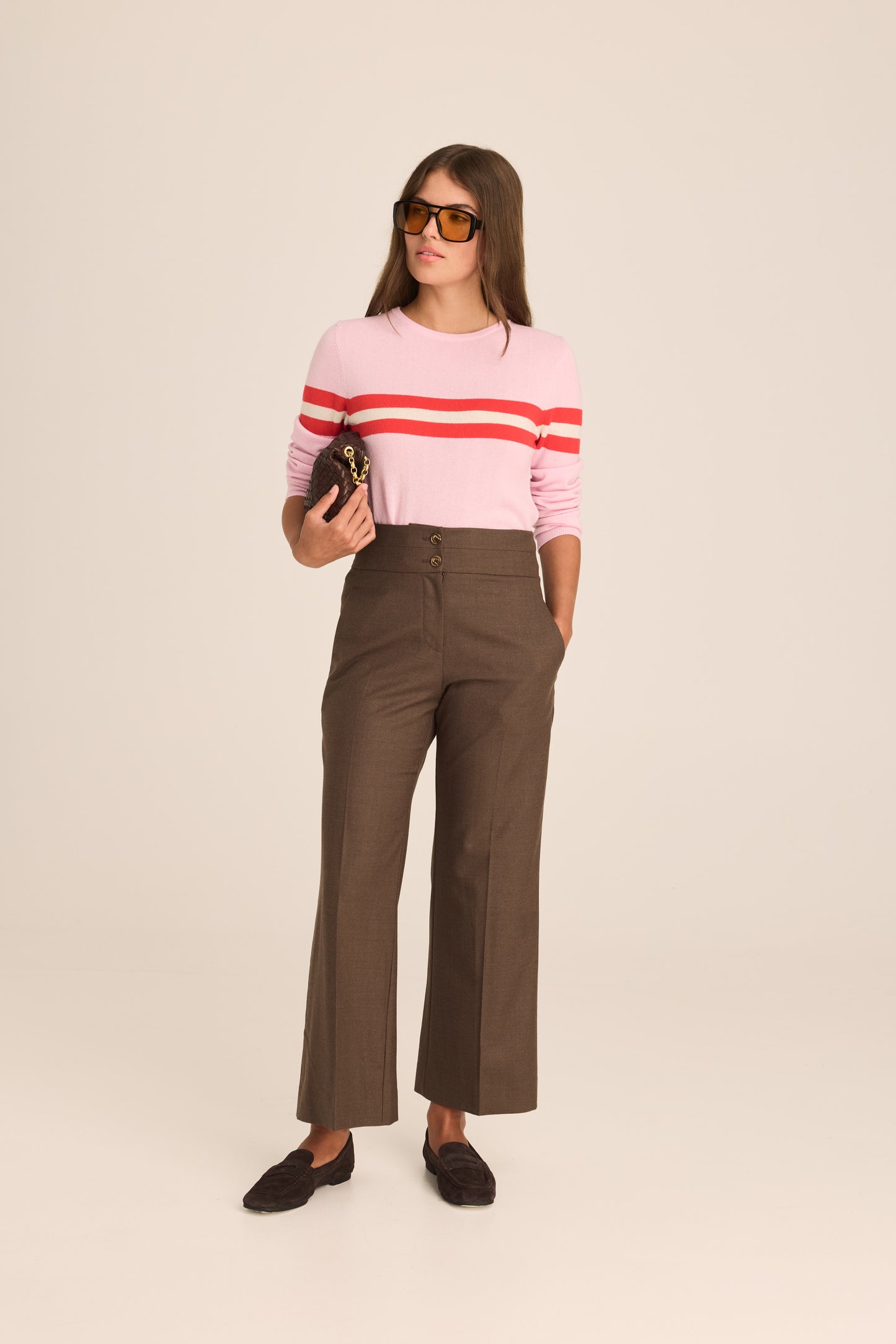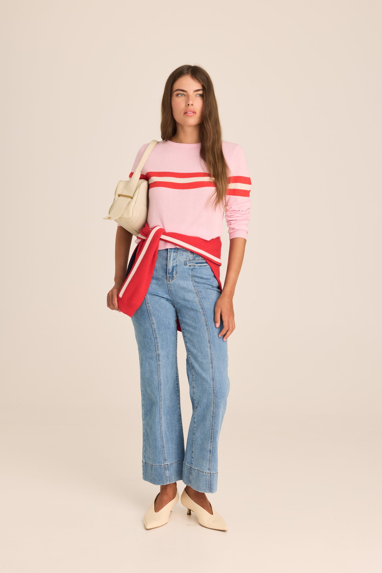 The French Racer jumper speaks of versatility, quality and a simple, timeless style; no wonder it has become a staple of the Jac Cadeaux range. This classic crew neck sweater is crafted in a blend of cashmere and Australian Merino wool. This essential knit, un peu sportif, with pink base and red and white stripe on the chest, is an ideal Autumn/Winter sweater that can be worn with jeans, pants or a skirt.