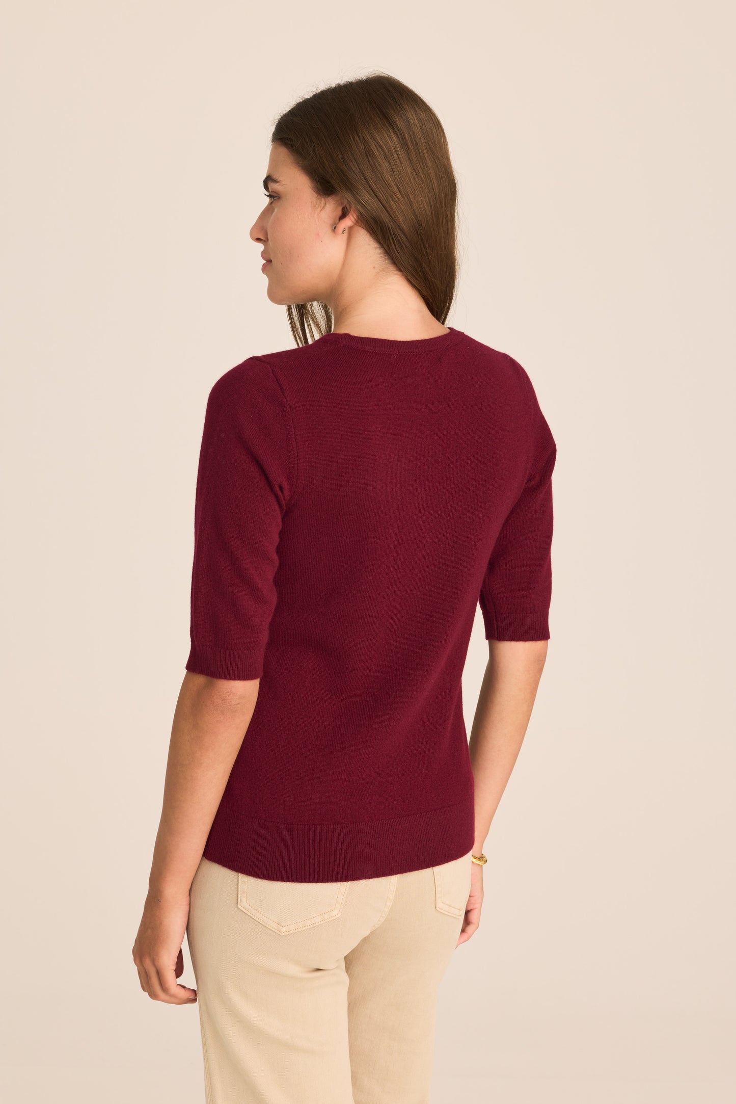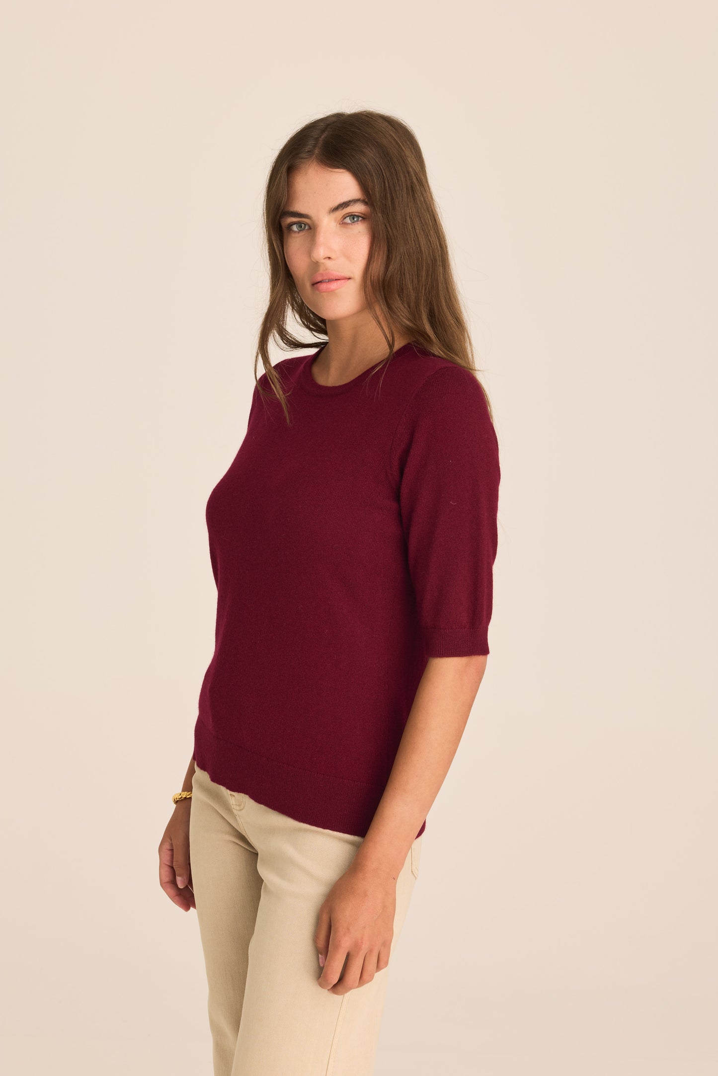 The Margaux knit top, crafted in Australian merino wool/cashmere blend is just that little bit sunnier and suited to less chilly days, with its elbow length sleeves and comfortably cut round neck. A classic top with the sleeve falling elegantly on the elbow, it is ribbed at hem of sleeve and neckline. A wardrobe staple that is perfectly paired with your favourite pant, skirt or under a blazer.