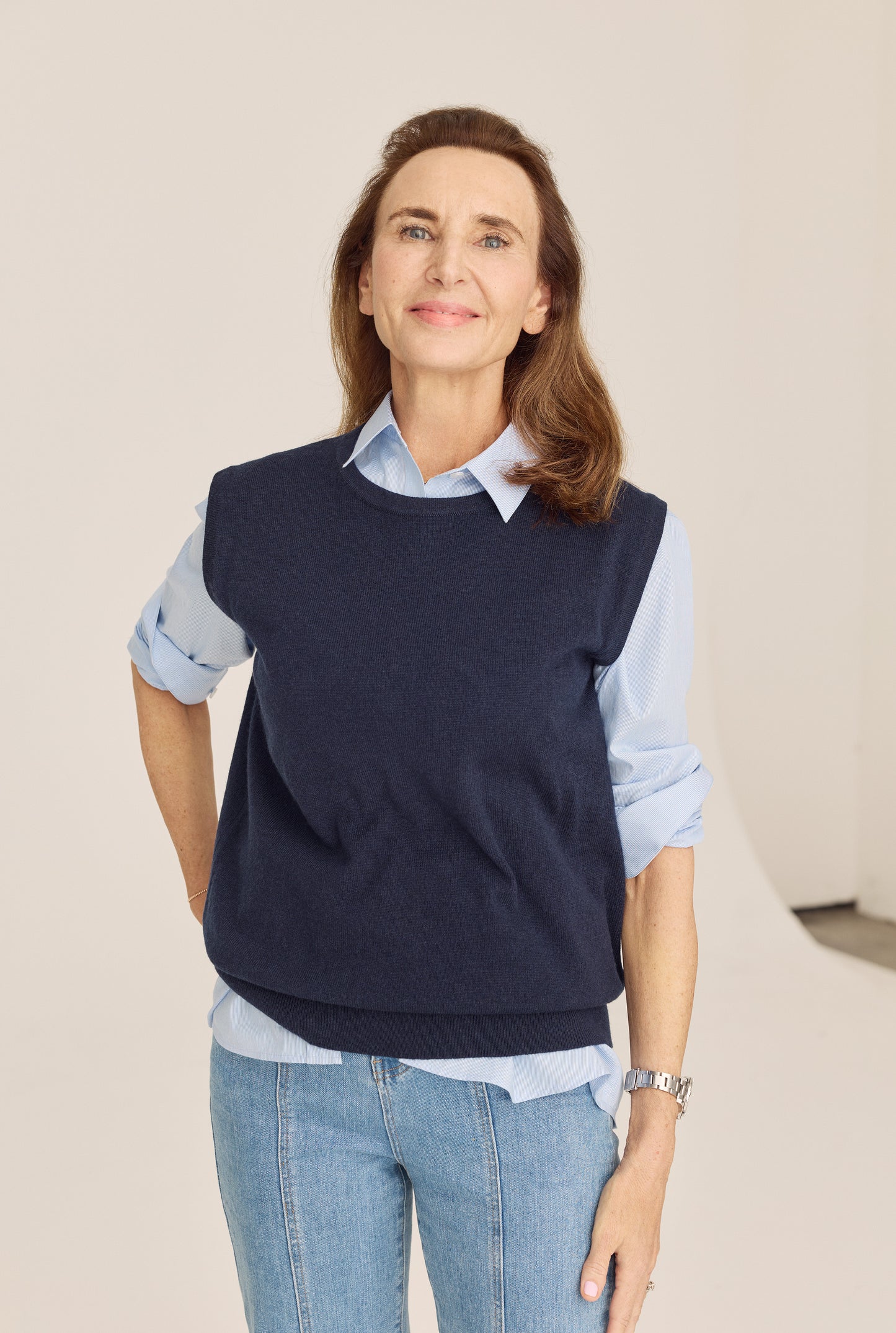 Her elegance is instinctive — a navy stripe, a softly tailored knit, a coat thrown effortlessly over her shoulders. It’s the art of quiet confidence.I